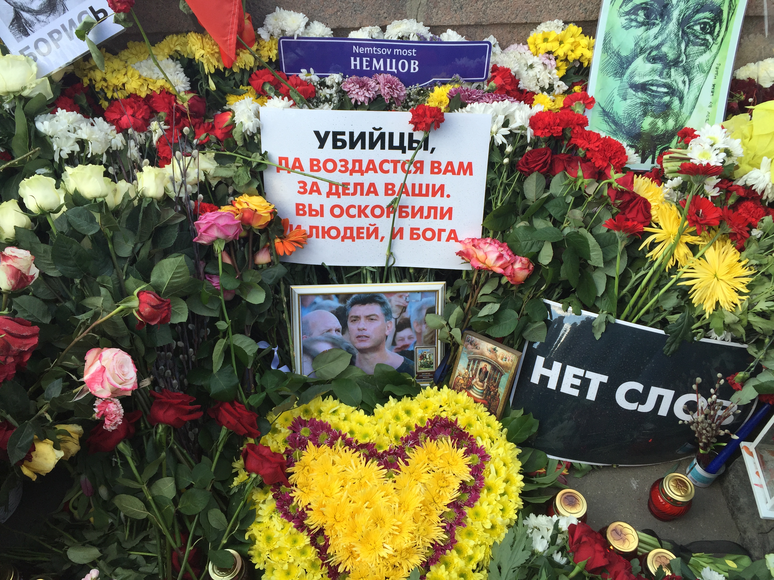 Ночью на месте гибели политика остался лишь один российский флаг. Цветы, свечи и портреты исчезли.