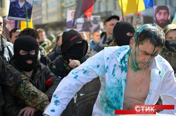 Что происходит на этих снимках? Штурмовики "Правого сектора" возят по Ивано-Франковску в мусорном баке руководителя областной юстиции Василия Кавацюка. Думаете за то, что взяточник, нарушал закон? Нет, все намного страшнее. Его унижали, ему угрожали, требуя подписать прошения об отставке за то, что он закон исполнил - зарегистрировал в области ячейку парламентской партии - "Оппозиционного блока". Нацистов, разумеется, не наказали. Онежедети. Это младенцев на Донбассе убивать можно за то, что их отцы не хотят жить в этой милой европейской стране, которая на снимках. То не младенцы, а "личинки колорадов". А эти - в черных колпачках - они свои, опора демократии.