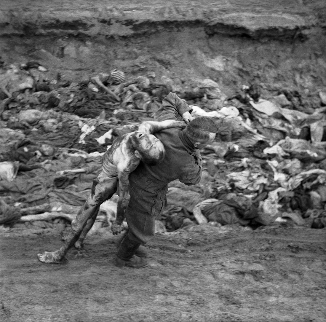 Охранник концентрационного лагеря Берген-Бельзен несет тело узника к месту массового захоронения. Германия, апрель 1945 года