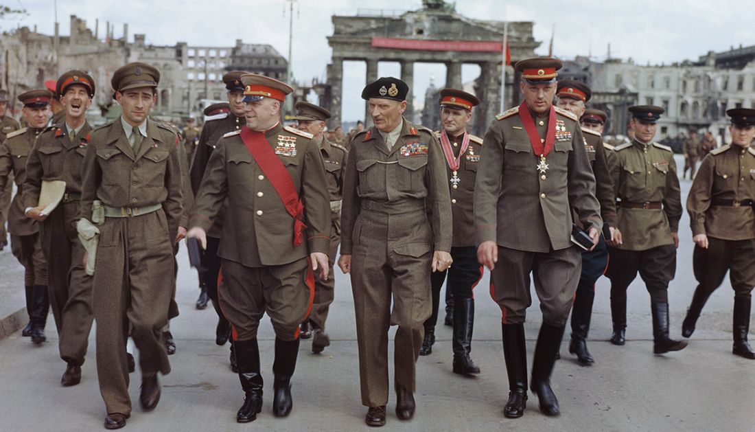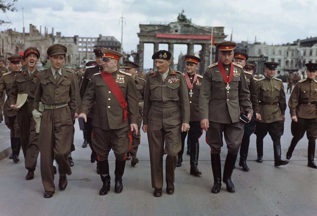 Маршалы Советского Союза Георгий Жуков и Константин Рокоссовский, генерал-фельдмаршал Бернард Монтгомери (в центре). Берлин, июль 1945 года