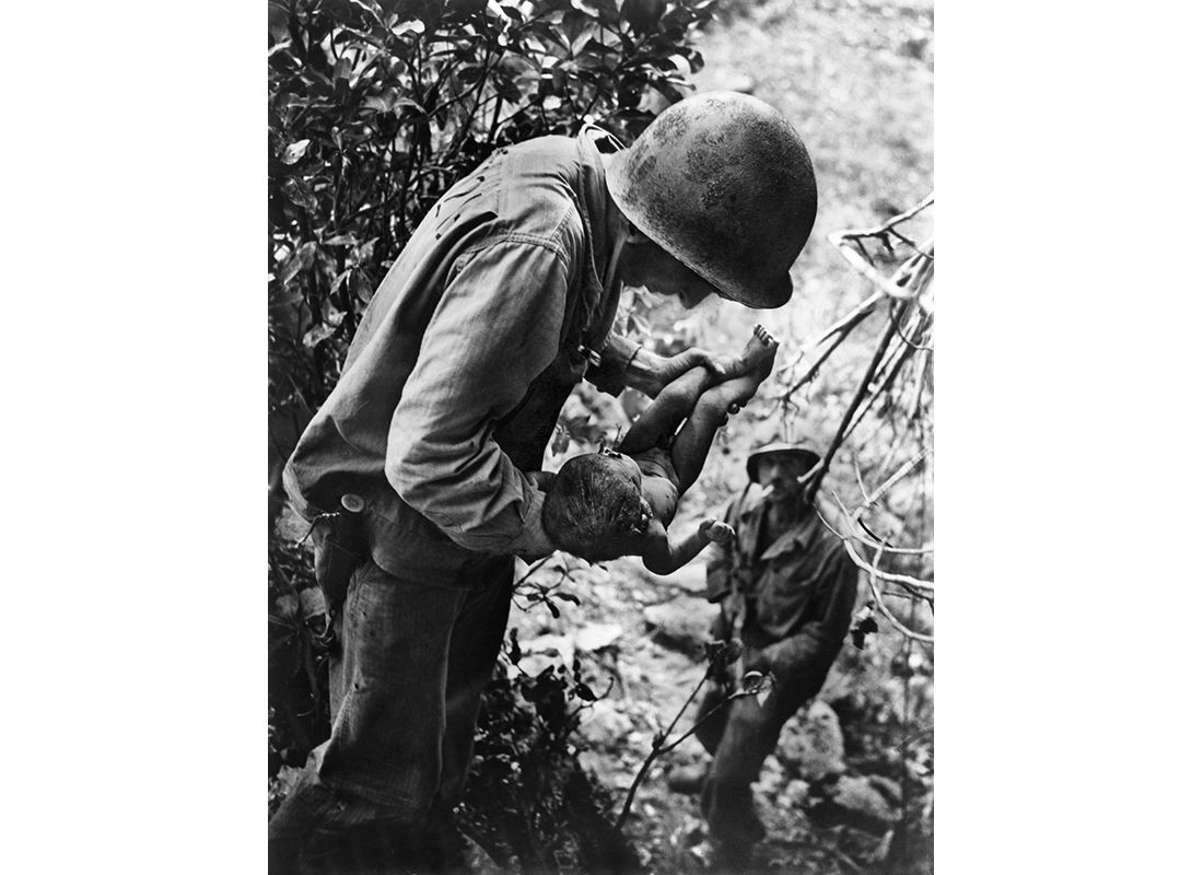 Морской пехотинец держит на руках раненого ребенка. Остров Сайпан, июнь 1944 года