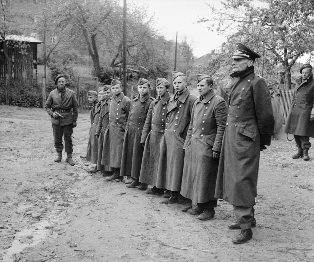 Майор немецкой армии со своими солдатами 13-16 лет, захваченные недалеко от города Гестхахт на Эльбе. Италия, апрель 1945 год