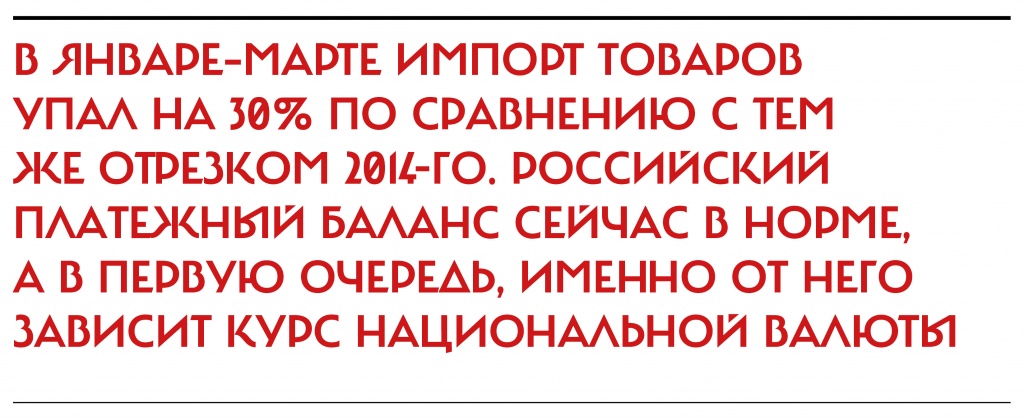 Вывоз капитала российским частным сектором в I квартале 2015-го, хоть и велик ($33 млрд), но все же ощутимо меньше исторически рекордных $73 млрд в IV квартале 2014-го. Добавим и экономию на народе: в январе–марте импорт товаров упал процентов на 30 по сравнению с тем же отрезком 2014-го. По этим причинам российский платежный баланс сейчас в норме, а в первую очередь, именно от него зависит курс национальной валюты в те периоды, когда наши власти не переворачивают все вверх дном. А они как раз взяли паузу.