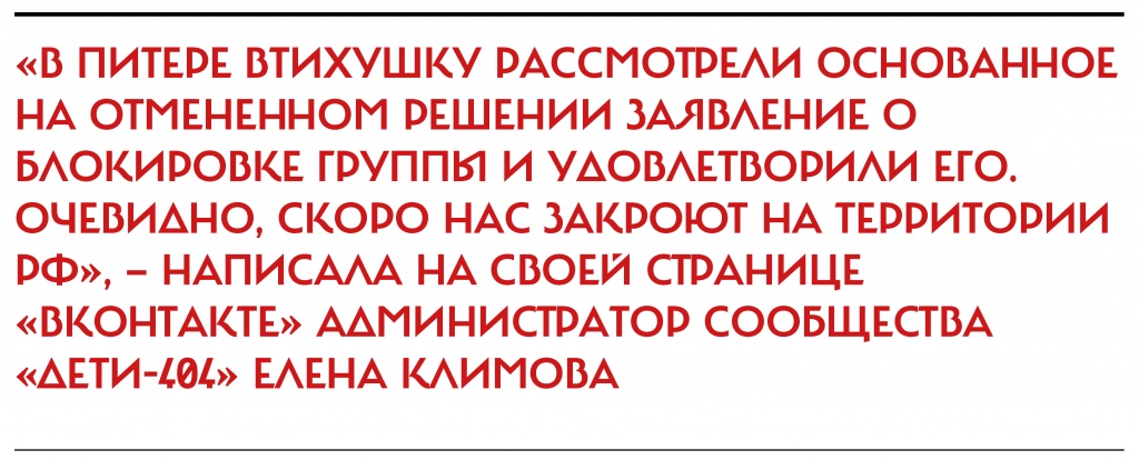 Суд принял решение о блокировке группы «Дети-404». Решение вынес Октябрьский районный суд Санкт-Петербурга. Таким образом, в скором времени группа поддержки ЛГБТ-подростков в социальной сети «ВКонтакте» будет недоступна на территории РФ. Ранее администратор сообщества Елена Климова была оштрафована на 50 тыс. рублей по ч.2 статьи 6.21 КоАП РФ («Пропаганда нетрадиционных сексуальных отношений среди несовершеннолетних»). Однако позже суд вышестоящей инстанции отменил это решение.