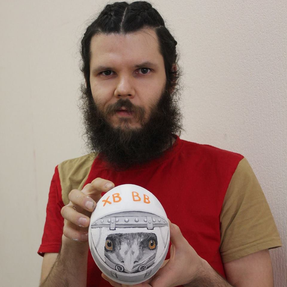 – Это страусиное яйцо, – говорит Жунев. – Я пытался изобразить страуса-космонавта в шлеме. Мне форма яйца напомнила шлем.