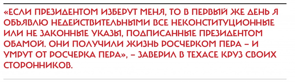 «Если президентом изберут меня, то в первый же день я объявлю недействительными все неконституционные или не законные указы, подписанные президентом Обамой. Они получили жизнь росчерком пера — и умрут от росчерка пера», — заверил в Техасе Круз своих сторонников.