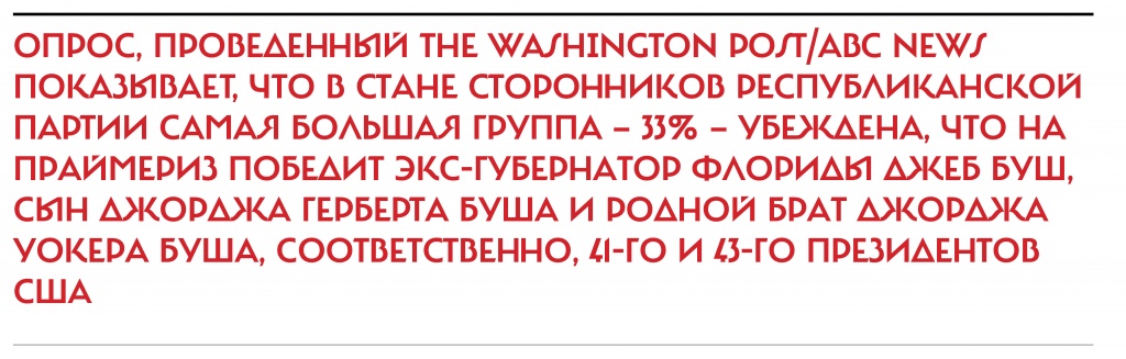 Приходу чернокожего демократического кандидата в Белый дом в 2008 году в немалой степени способствовал «антибушевский синдром», который переживала тогда Америка. Сегодня падающая популярность Барака Обамы, наоборот, делает достаточно востребованным семейный бренд Бушей. Опрос, проведенный The Washington Post/ABC News показывает, что в стане сторонников Республиканской партии самая большая группа — 33% — убеждена, что на праймериз победит экс-губернатор Флориды Джеб Буш, сын Джорджа Герберта Буша и родной брат Джорджа Уокера Буша, соответственно, 41-го и 43-го президентов США.