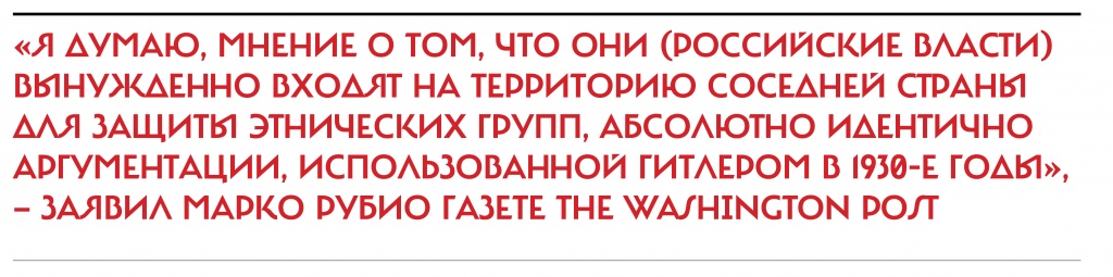 В целом, по поводу роли Москвы в событиях на Украине первые американские выдвиженцы в президенты занимают абсолютно солидарную позицию. «Я думаю, мнение о том, что они (российские власти) вынужденно входят на территорию соседней страны для защиты этнических групп, абсолютно идентично аргументации, использованной Гитлером в 1930-е годы», — заявил Марко Рубио газете The Washington Post.