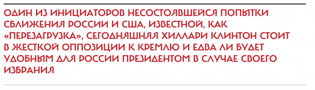Один из инициаторов несостоявшейся попытки сближения России и США, известной, как «перезагрузка», сегодняшняя Хиллари Клинтон стоит в жесткой оппозиции к Кремлю и едва ли будет удобным для России президентом в случае своего избрания. Присоединение Крыма и вовлеченность Москвы в конфликт на востоке Украины, бывшая госсекретарь сравнивает с политикой аншлюса, которую вела перед Второй мировой войной нацистская Германия.