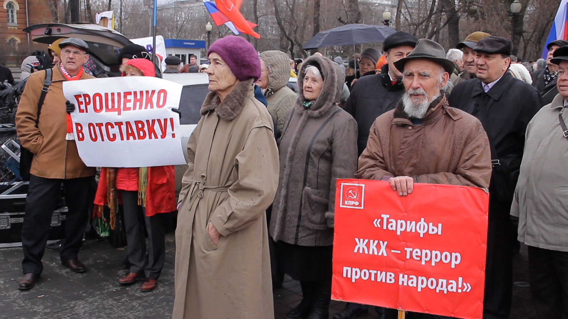 Участники митинга промокли до нитки, с погодой не повезло: был дождь и сильный ветер, но выстояли до конца. Говорят, что до победного конца будут добиваться отставки губернатора и возможности самим выбрать нового главу региона.