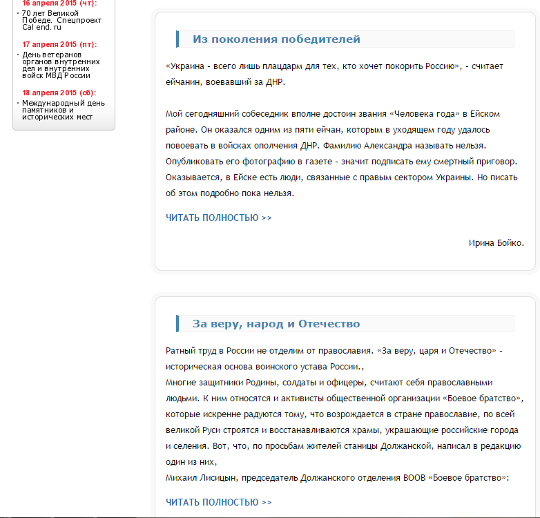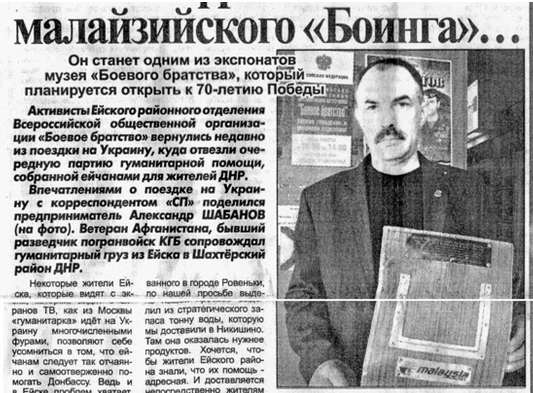 "Активисты Ейского районного отделения Всероссийской общественной организации "Боевое братство" вернулись недавно из поездки на Украину, куда отвезли очередную партию гуманитарной помощи собранной ейчанами для жителей ДНР", – говорится в местной газете "Совет Приазовья". Статья была опубликована 2 апреля, ее автору Ирине Бойко активист "Боевого братства", разведчик пограничных войск и афганский ветеран Александр Шабанов рассказал про передачу обломка: "В благодарность за поставленные продукты, одежду и медикаменты жители поселка Рассыпное передали ейчанам фрагмент малайзийского "Боинга 777", потерпевшего крушение над Шахтерским районом в июле прошлого года".