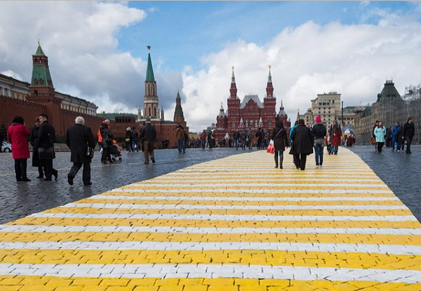 Желто-белую разметку на Красной площади в виде пешеходного перехода управление делами президента объяснило подготовкой Министерства обороны России к предстоящей репетиции парада и самим праздничным мероприятиям 9 мая.