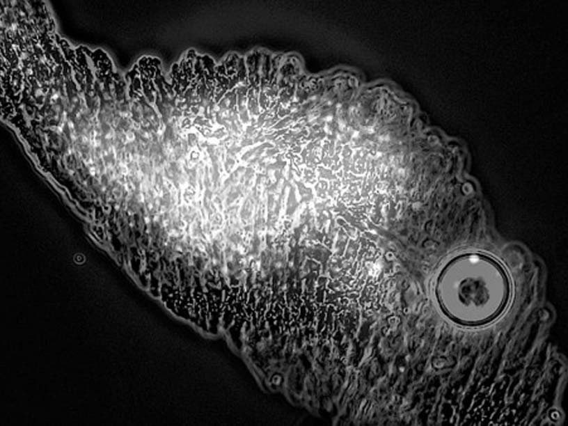 Как оказалось, культуры Metallosphaera sedula, которые обрабатывали вещество метеорита, за две недели выделяли столько натрия, сколько аналогичные культуры на земных химических соединениях производили за два месяца. На микрофотографии археи Metallosphaera sedula видны в виде маленьких черных точек на частице измельченного в порошок метеоритного вещества.