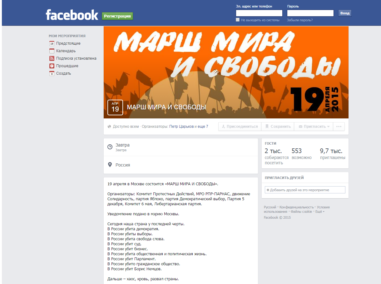 "Марш мира и свободы" Комитет протестных действий, Комитет 6 мая, движение "Солидарность", партии РПР-ПАРНАС, "Яблоко", "Демократический выбор", "5 декабря", Либертарианская партия планировали устроить 19 апреля в центре Москвы. Но московские власти предложили провести шествие, с численностью участников до 30 тысяч человек, на северо-западе города – от станции метро "Октябрьское поле" до "Щукинской". Оппозиционеров и организаторов это не устроило, и они решили отказаться от идеи марша, но не от выступлений в защиту мира и свободы.