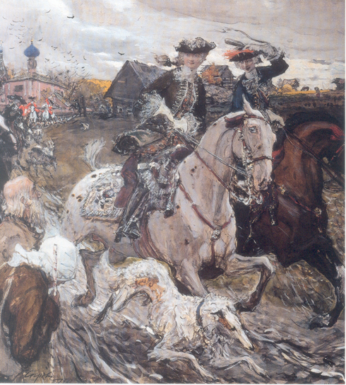Как и все «мирискуссники» Серов - поклонник XVIII века. Но его интересует не парадная история, его занимают бытовые подробности жизни царствующих особ: «Кубок Большого орла», «Петр I верхом на взморье», «Петр I на работах». В любимой многими картине «Выезд императора Петр II и цесаревны Елизаветы Петровны на охоту» - множество мельчайших подробностей эпохи.