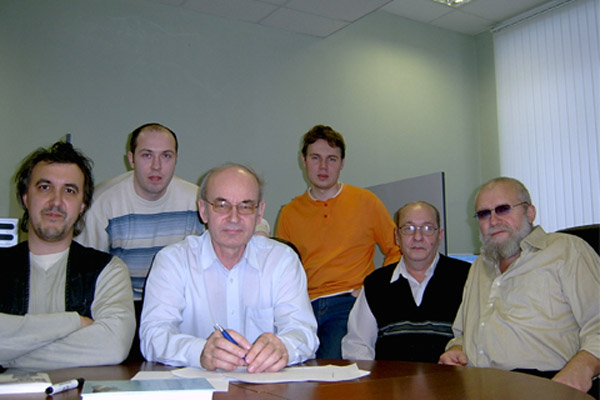 Владимир Голубев (крайний справа) с коллегами. Фото: sagemd.comНо есть такие: "Я спокойно работал, как мог, поскольку не мог сменить "климат" из-за невозможности обменять квартиру и вывезти мою семью, члены которой, жена и две дочери, оказалась заложниками моего положения. Сменить квартиру на Нижний Новгород и вывезти семью мне удалось только где-то в 2000 году, однако сам я остался жить и работать в Сарове. Отчасти это было связано со "спортивным интересом", то есть с той же глупостью, смогу ли я устоять при постоянном прессинге системы. С другой стороны, казалось, что развитие общества пойдет в прогрессивном направлении и методы и средства, используемые административной властью, будут меняться. Придавить меня путем лишения каких-то средств производства типа "молотка и зубила" было невозможно, поскольку я полностью перешел на аналитико-теоретический род деятельности и все мои инструменты умещались в моей голове, оторвать которую третирующие меня граждане не решались или не могли".