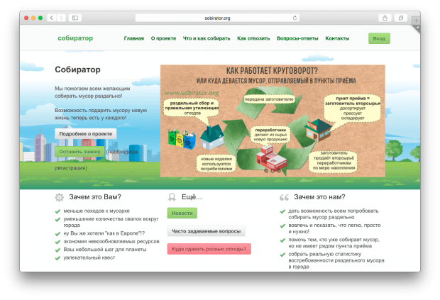 Цель проекта «Собиратор» — массовое внедрение системы раздельного сбора отходов. Это волонтерский проект, где все участники и организаторы проекта действуют на добровольной основе в рамках собственных возможностей и желаний.