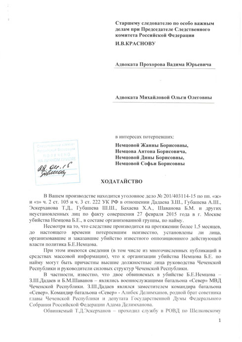 22 апреля адвокаты потерпевших по уголовному делу об убийстве оппозиционного политика Бориса Немцова — Вадим Прохоров и Ольга Михайлова — обратились к руководителю следственной группы СК РФ генералу Игорю Краснову с ходатайством о допросе главы Чеченской Республики Рамзана Кадырова, депутата Государственной Думы Адама Делимханова, члена Совета Федерации от Чеченской Республики Сулеймана Геремеева, а также ряда военнослужащих полка «Север» Внутренних войск МВД России, дислоцированного в Чечне.