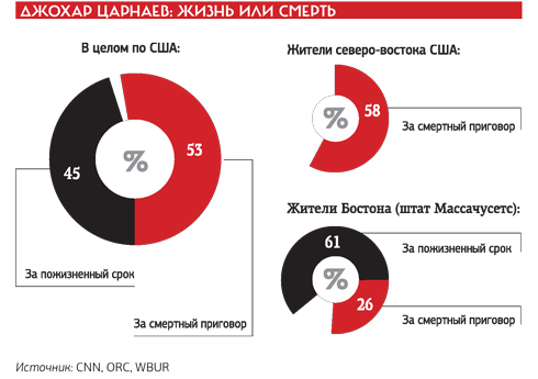 «Я против смертной казни для Царнаева, потому что это противозаконно в нашем штате», — говорит журналисту пикетчик Джо Кабанос. Действительно, после Филиппа Беллино и Эдварда Гертсона, окончивших жизнь на электрическом стуле в мае 1947 года за убийство бывшего морпеха, высшая мера наказания больше в штате Массачусетс не приводилась в исполнение, а в 1984-м и вовсе была отменена. Джо разворачивает плакат, на котором черным маркером на листке ватмана выведено: «Смертная казнь — это убийство». Слово «убийство» он выделил красным цветом.