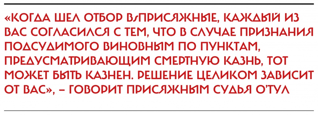 Седовласый судья Джордж О'Tул, из-под черной судейской мантии которого выглядывает шоколадный галстук с белой, в тон рубашки, полоской, окидывает испытующим взглядом присяжных, имена которых засекречены: «Надеюсь, никто из вас ни с кем не разговаривал о деле, которое мы рассматриваем?» — на всякий случай спрашивает судья.