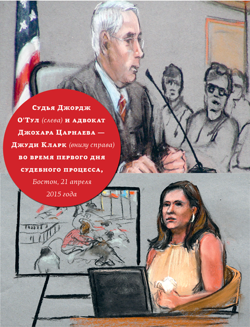 Адвокаты Царнаева — Джуди Кларк и Мириам Конрад — что-то нашептывают ему, иногда успокаивающе оглаживая его по рукаву серого пиджака. Джохар кивает, а потом углубляется в переданный ему текст — скорее всего, это только что поданное адвокатами ходатайство о пожизненном заключении. Иногда он вопросительно тыкает красивым длинным пальцем в какую-нибудь строку, и адвокат Кларк на ухо дает ему пояснения.