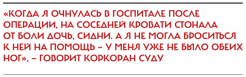«Потом меня понесли, и только тогда я начала кричать от боли — до этого боялась, что дочка увидит меня и испугается. Я деревенела, и судорога сводила пальцы, — Селести поднимает напряженно изогнутые пальцы с нежно-бирюзовым лаком на ногтях. — Когда я очнулась в госпитале после операции, на соседней кровати стонала от боли Сидни. А я не могла броситься к ней на помощь — у меня уже не было обеих ног», — говорит она суду.