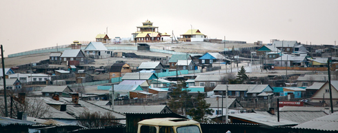 Буддистский дуган (храм) виден практически из любой точки поселка, Забайкальский край, пос. Могойтуй, апрель 2015 года