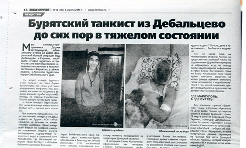 3 апреля на сайте, а позже и на страницах газеты «Новая Бурятия» появилось короткое интервью с Сэсегмой Батомункуевой, матерью танкиста-наводчика Доржи, тяжело раненного во время боев под Дебальцево, о котором «Новая газета» рассказала еще в начале марта. В этой заметке мать обгоревшего танкиста жаловалось, что раненому сыну военные не помогают и что сын находится в тяжелом состоянии. Через сутки, 4 апреля, текст интервью с сайта «Новой Бурятии» исчез. Не оказалось его и в бумажной версии газеты, а само издание вместо воскресенья, как обычно, пришло к читателям на день, а то и два позже, да еще и похудевшим: вместо привычных двадцати страниц в газете оказалось только девятнадцать.