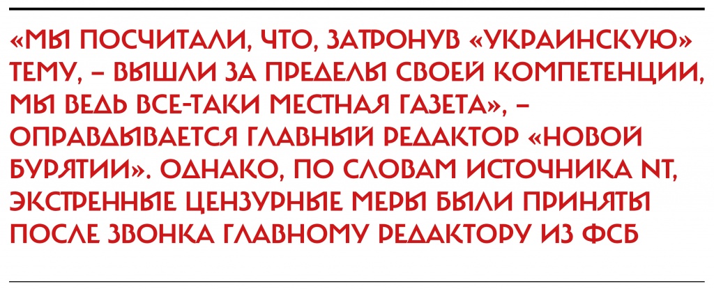 «Сначала появилась информация, что полосы пришлось удалить, потому что фотография танкиста на них плохо пропечаталась, но у меня дома есть нетронутый экземпляр. С качеством печати там все порядке», — рассказал корреспонденту NT бурятский журналист Аркадий Зарубин, редактор местной газеты «Аршан». «Мы посчитали, что, затронув «украинскую» тему, вышли за пределы своей компетенции, мы ведь все-таки местная газета», — оправдывается главный редактор «Новой Бурятии» Тимур Дугаржапов. «Это было наше собственное решение, я посоветовался с некоторыми людьми, коллегами, но на нас никто не давил», — уверяет Дугаржапов. Однако, по словам источника NT, близкого к редакции бурятской газеты, просившего не называть его имя, «советовался» главред отнюдь не с коллегами: экстренные цензурные меры были приняты после звонка главному редактору из ФСБ. «Потерять лицензию — это значит заморозить выпуск на два-три месяца, — объясняет собеседник NT суть угроз, озвученных ведомством. — Зарегистрироваться под другим названием — не проблема, но коллектив останется без зарплаты на время вынужденного простоя, а людям нужно кормить семьи». Редакция оказалась перед выбором: или вручную удалить из газеты полосу с интервью, или просто изъять тираж и не выполнить обязательства перед рекламодателями, создавая себе серьезные финансовые трудности.