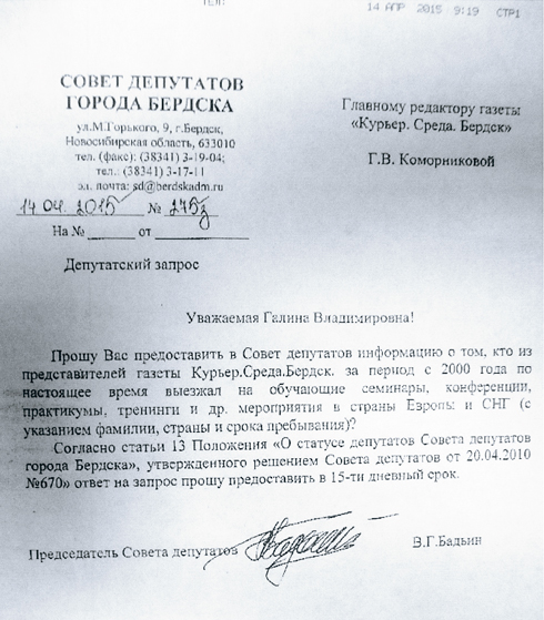 На снимке — оригинал запроса председателя горсовета в редакцию еженедельника «Курьер. Среда. Бердск»