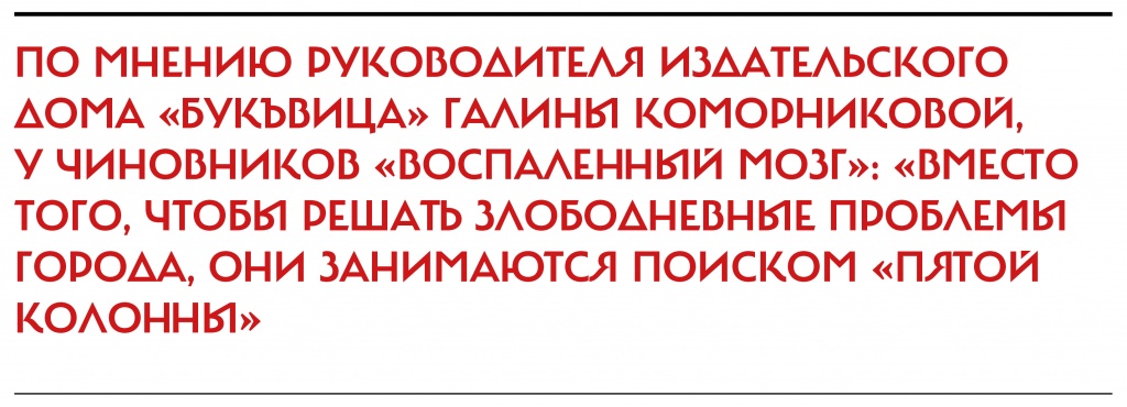 По мнению руководителя издательского дома «БукЪвица» Галины Коморниковой, у чиновников «воспален мозг»: «Вместо того чтобы решать злободневные проблемы города, они, видимо, от недогруженности работой занимаются поиском «пятой колонны», — сказала она автору этих строк. Что касается слов спикера о переборе негатива в местных СМИ, то Коморникова язвит: «Может быть, это публикации о пикете школьницы, которая протестовала против покупки автомобиля для совета депутатов? Так часть горсовета тоже была против. Они что, тоже входят в «пятую колонну»? — говорит она.