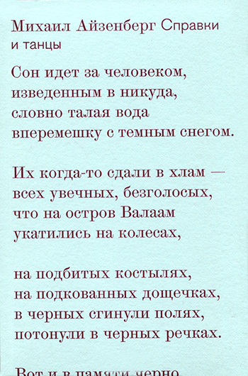Первое столкновение уродливо-искусственного с естественным в «Справках и танцах» совершается во втором стихотворении сборника «Сон идет за человеком…», вынесенном на обложку. Парадоксально, что уродство здесь проявляется в избавлении от уродства, постыдном историческом факте: инвалидов войны отправляли на остров Валаам, где они доживали остаток дней в ужасных условиях (там их запечатлел в известной серии рисунков художник Геннадий Добров). Вместе с тем валаамский сюжет в стихотворении Айзенберга — лишь сравнение, иллюстрирующее душевное состояние, уподобляемое, в свою очередь, дурному сну (текущей реальности), где говорящий вынужден пить «хлебное вино» «на пиру у людоедов». Онейрический мотив в поэзии Айзенберга почти так же важен, как мотив воздуха, и так же амбивалентен. Сон может быть формой блаженного эскапического ухода (каковым он, собственно, и является биологически: средством перехода в новый цикл активности): «И опять начинается сон, / призывающий старших» — или, из соседнего стихотворения о земле: «А теперь из травы забытья / привстает, невредима, / говорит, что и ты не судья, / и она не судима». Но он может быть, как в стихотворении «Сон идет за человеком…», и темным мороком, от которого невозможно очнуться.