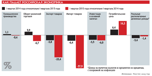 Прежде всего — не такое серьезное, чем ожидалось, падение промышленного производства. Сводка Росстата за I квартал 2015 года действительно довольно интересна на фоне всеобщего февральско-мартовского ожидания немедленной гибели. Де-факто на все происходившие в 2014–2015 годы катастрофы в реальном мире — это и украинская война, и санкции, и международная изоляция — собственно экономика ответила обвалом инвестиций на уровне до 10 %, умеренным падением частного спроса и реальных располагаемых доходов (в основном — последствия инфляционного скачка, вызванного девальвацией рубля), снижением оборотов розничной торговли и ростом сбережений. Последнее можно трактовать как признание экономическими агентами кризиса как такового. Хотя истерическая волна потребления в декабре-январе смазала эту картину, и население, и частные компании вели себя в I квартале в целом так, как полагается вести себя перед лицом неизбежного спада: потребление снижается, норма сбережений растет.