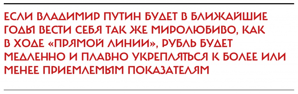 Так на фоне 5-процентного сокращения оборота розницы русский рубль становится валютой мечты. При этом ответ на вопрос «Надолго ли?» — неуверенно положительный. Расчеты Минэкономики показывают, что если Владимир Путин будет в ближайшие годы вести себя так же миролюбиво, как в ходе «прямой линии», рубль будет медленно и плавно укрепляться к более или менее приемлемым показателям, хотя и не достигнет предкризисной твердости.