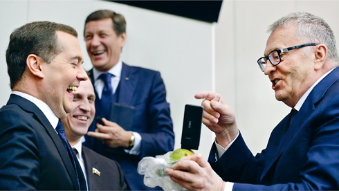 Премьер Дмитрий Медведев после отчета о деятельности правительства в Госдуме с ее вице-председателем Александром Жуковым (в центре) и лидером ЛДПР Владимиром Жириновским (справа), Москва, 2015 год