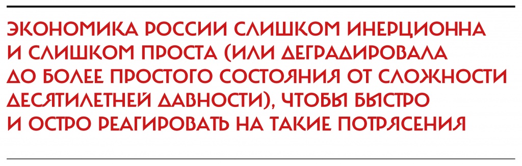Есть несколько объяснений тому, как страна, пережившая сильнейший за последние пятнадцать лет внешний шок, падение на десятки процентов экспортных доходов, не проваливается в острую рецессию. Все они более или менее рациональны, но проверяемы лишь постфактум. Первая и наиболее очевидная история: экономика России слишком инерционна и слишком проста (или деградировала до более простого состояния от сложности десятилетней давности), чтобы быстро и остро реагировать на такие потрясения. В этом случае ответ на шок будет «размазанным» по времени, зато и выходить из такой потери темпов роста придется много лет. Есть еще несколько историй о том, как правительство нашло резервы для роста, но большинство из ресурсов, поддержавших экономику с начала года, разовые.