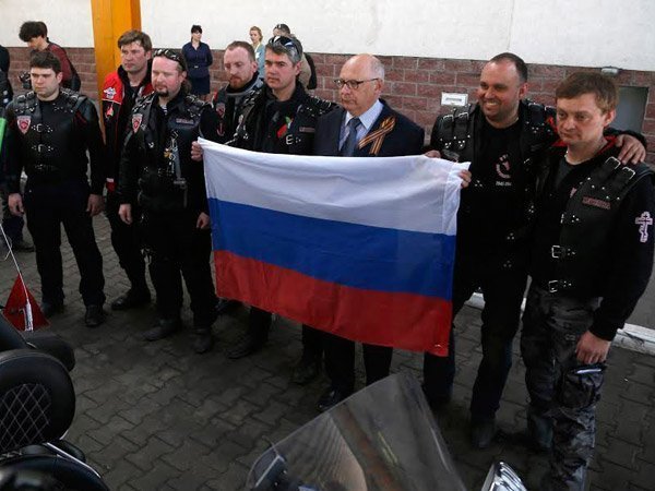 «Ночные волки» на польской границе. Фото: gazeta.pl Комментарий редактора: В тот же день руководство «Ночных волков» заявило, что передает эстафету мотопробега своим польским товарищам. «По причине того, что "Ночным Волкам" официально закрыли въезд в Польшу, Хирург передаст послание европейцам через своих польских друзей байкеров. Наши братья по духу все равно доедут до Берлина!» — отмечалось в сообщении клуба.