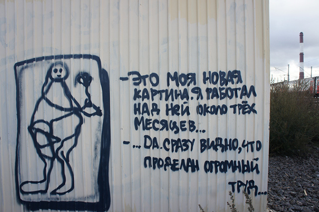 У меня нет никакой техники, кроме ярко выраженного отсутствия художественного образования. Я рисую именно так, как у меня это получается. На первое место я зачастую ставлю смысл работы, а не качество исполнения. И да, я считаю, что современный художник должен уметь в первую очередь думать, а уж потом рисовать. У меня нет любимых работ. Все мои рисунки на стенах одинаково важны для меня и одинаково безразличны. Я же не глянцевый богемный художник, кричащий: «Не дышите на шедевр!» Мне действительно важно создать работу, после этого я ее отпускаю, отдаю ее городу. Иначе я бы просто сошел с ума, наблюдая, как еженедельно мои работы закрашивают и отмывают.