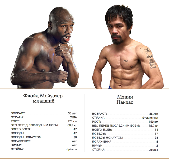 В том же 2012 году, когда Пакиао признался в любви к петушиным боям, Мейуэзер позвонил ему напрямую и предложил гонорар 40 миллионов долларов. Мэнни отказался, предложив разделить доходы от поединка в соотношении 55 на 45 в пользу Флойда. Американца это не устроило. Следующие два года новости о всякого рода контактах между командами боксеров появлялись регулярно, но в какой-то момент они перестали восприниматься всерьез.
