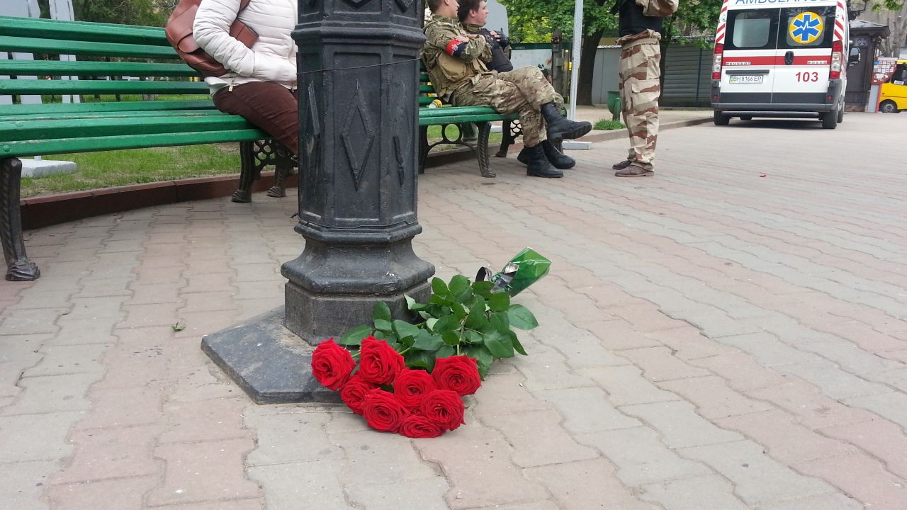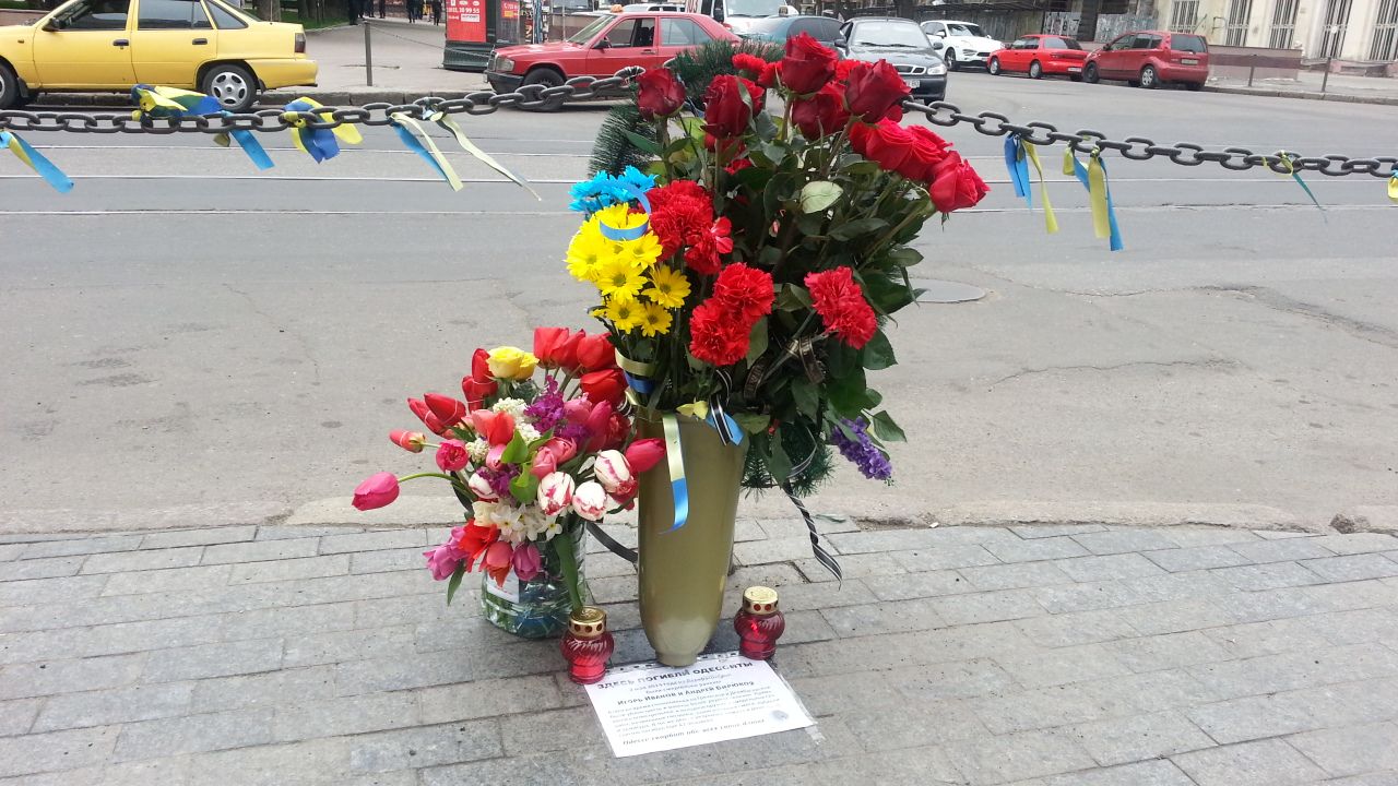 Перейдя дорогу, на улице Дерибасовской мы увидели новые траурные букеты. Их приносили на то место, откуда скорая помощь увозила первого погибшего в этих столкновениях – майдановца Игоря Иванова, сотрудника Жовтневого суда города Одессы.
