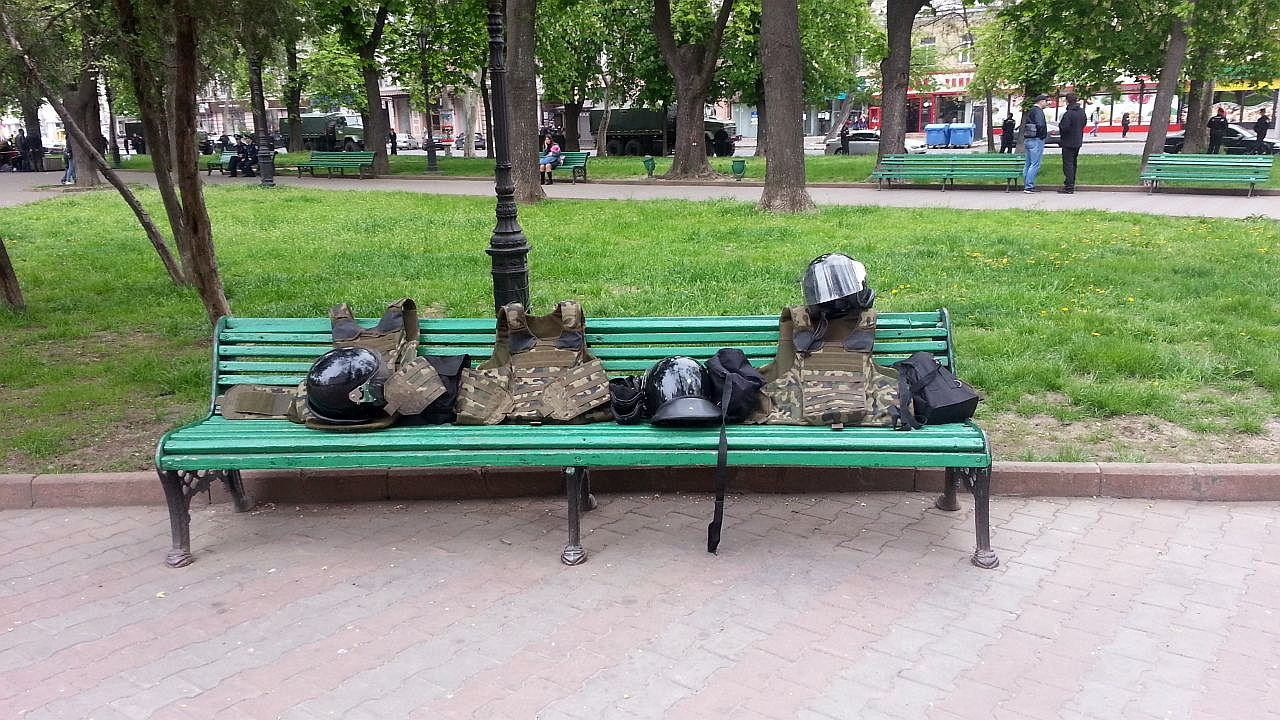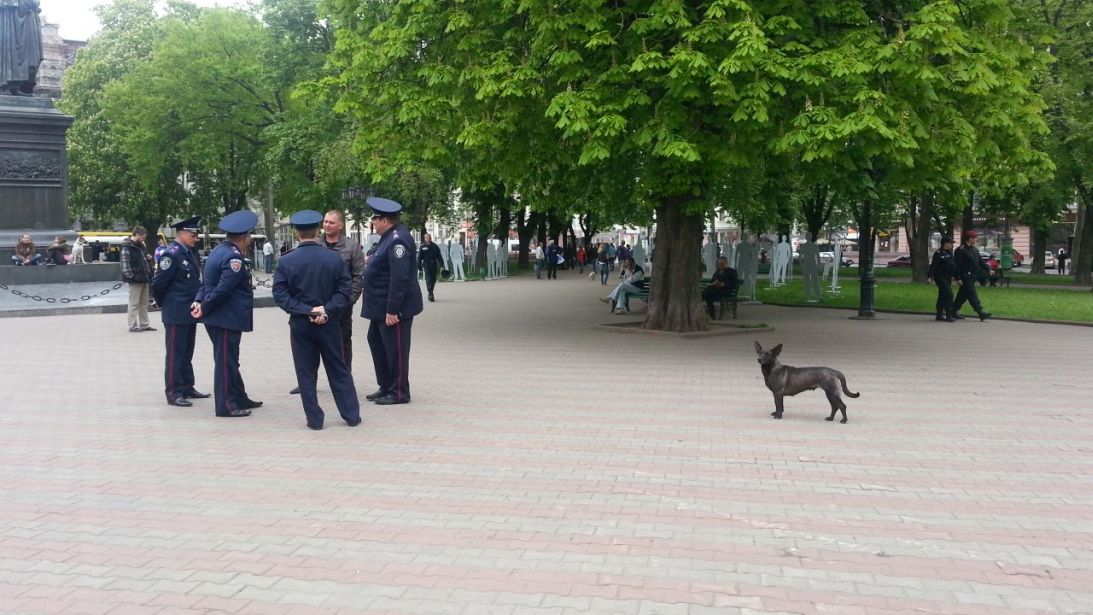 В Одессе две траурные точки. Это Дерибасовская, где 2 мая 2014 года развернулись первые бои, и Куликово поле, где погибла основная масса людей. Поэтому с самого начала планировалось два траурных мероприятия – на Соборной площади (в центре города) и возле Дома профсоюзов. Первое должно было состояться в 12 часов. Но в 12 на Соборной площади было пусто. Только отряды милиции. Ничто не угрожало порядку, поэтому силовики бесстрашно оставляли на скамейках защитную экипировку.