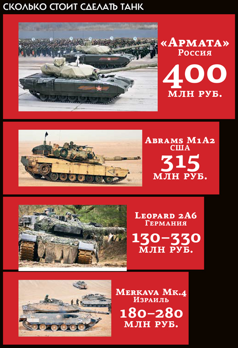 «Потом случился кризис, и стало понятно, что производство танка, одна единица которого обходится в сумму 400 млн руб., для государства весьма накладно. Когда нам сейчас говорят, что изготавливается ограниченная серия, а потом она будет два года проходить испытания в войсках — мы понимаем, что решение о серийном производстве не принято или как минимум отложено до более хлебных времен», — резюмирует Гольц. Для сравнения: последняя модификация немецкого Leopard 2A6 стоит сейчас в пересчете на рубли от 130 до 330 млн руб. ($2,5–6,5 млн). Один из лучших танков в мире — израильский Merkava Mk.4 — в районе 180–225 млн руб. ($3,7–5 млн). Американский Abrams M1A2 в зависимости от комплектации оценивается примерно в 315 млн руб. ($6,21 млн), правда, в 2014 году Саудовская Аравия закупила их по $1,9 млн за штуку, то есть почти в четыре раза дешевле, чем будет стоить «Армата».