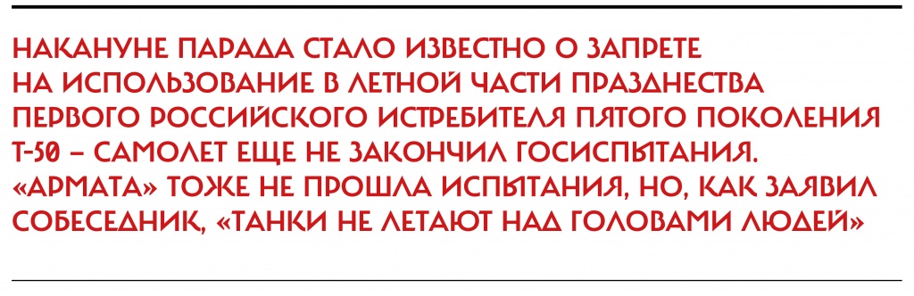 О неформальном запрете сообщил источник «Газеты.Ru» в Минобороны. По его словам, он связан с вопросами безопасности — самолет еще не закончил госиспытания. «Армата» тоже не прошла испытания, но, как заявил собеседник издания, «танки не летают над головами людей». Стоит напомнить, что демонстрационный полет прототипа Т-50 в июне 2014 года в подмосковном Жуковском завершился аварией — у истребителя отказала одна из силовых установок.