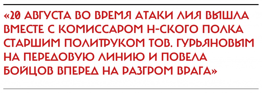 Как пламенная патриотка, верная дочь Ленинско-Сталинского Комсомола, Лия 1 августа 1941 года пришла в одну из частей нашей армии Западного фронта в качестве медсестры. С 7-го по 20-е августа Лия Канторович показала себя бесстрашной, отважной дружинницей на поле боя. 20 августа во время атаки Лия вышла вместе с комиссаром Н-ского полка старшим политруком тов. Гурьяновым на передовую линию и повела бойцов вперед на разгром врага. Во время боя осколком вражеского снаряда Лия была сильно ранена и через некоторое время скончалась среди боевых товарищей по части. Лия погибла героем…»