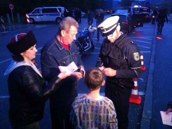 «Ночные волки» в Германии. Фото: nwrussia.info Тут уместно описание самих авторов. На сайте "Ночных волков" инцидент изложен так: "03 Мая 2015. «Нас с автобана завернули в «карман» и окружили более 20 полицейских с собаками . Пока проверяют документы! Дальше был досмотр под предлогом террористической угрозы. В колонне ехала одна машина сопровождения, в которой находились двое несовершеннолетних детей и трое взрослых. Также, в колонне, двигался один мотоцикл. На нем — гражданин Австрии. Сзади шли две машины с дипномерами, в которых находились российские дипломаты. Полицейские вели эту колонну задолго до подъезда к Мюнхену. Но, приближаясь к городу, они начали осуществлять маневры на дороге. Сначала пристроилась одна машина и стала отделять мотоциклиста от машины сопровождения. Затем от них отсекли дипломатов. Вся колонна — четыре автосредства. Мотоцикл сразу оцепили. Документы забрали у всех, даже у дипломатов".