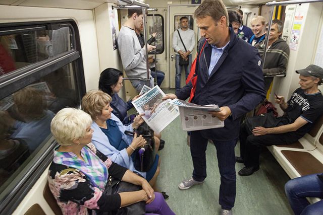 Фото: navalny.livejournal.com Алексей Навальный раздает агитационные газеты в метро. Август 2013-го