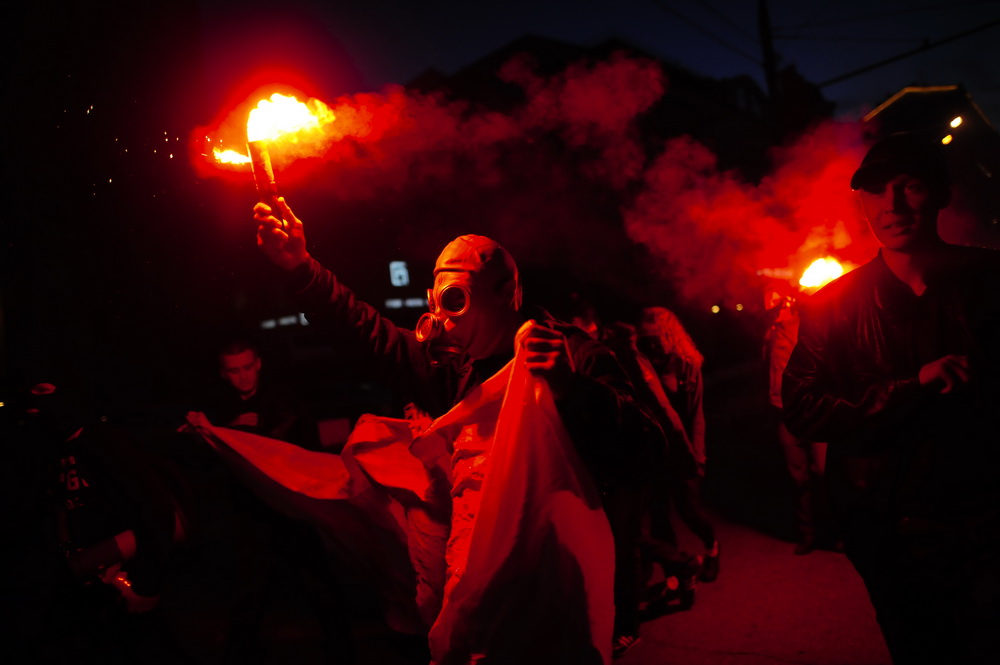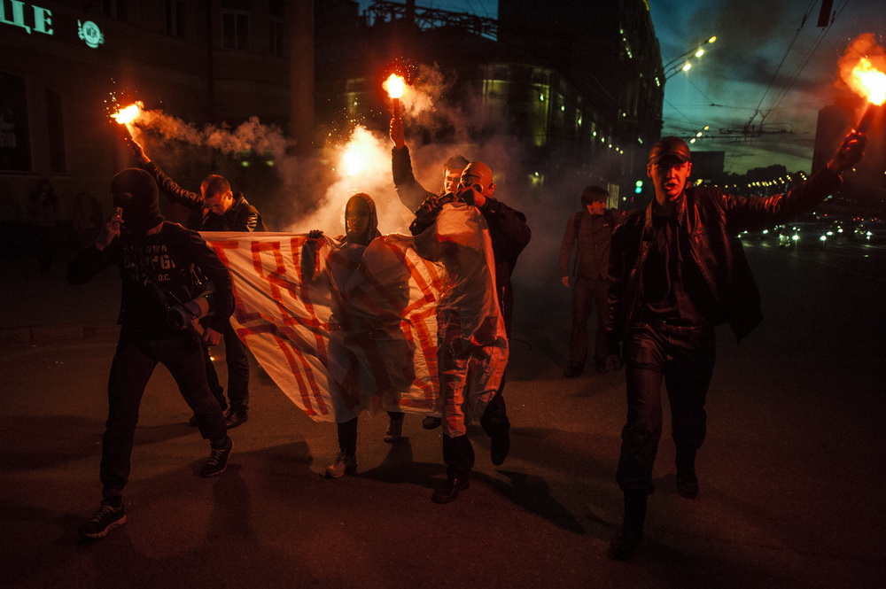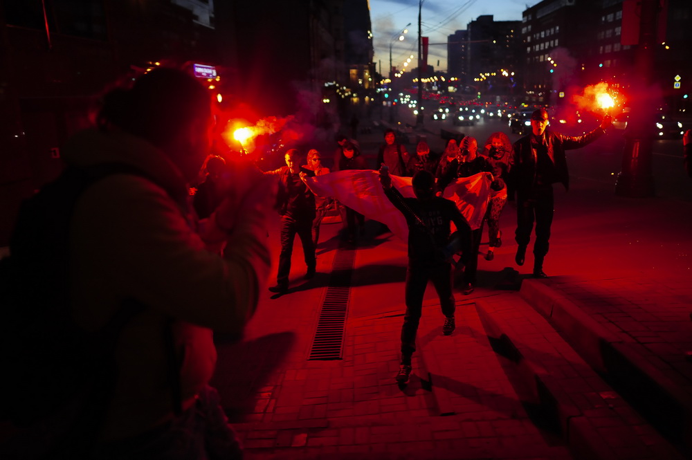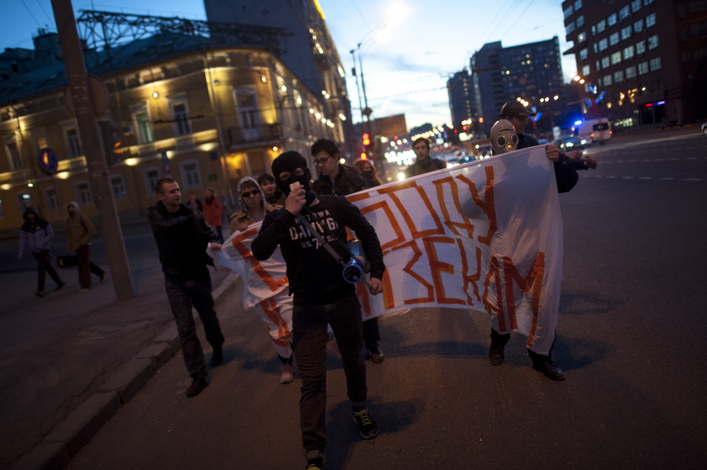 С баннером «Свободу политзекам», файерами и скандируя лозунги активисты маршировали по Садовому в районе станции метро «Красные ворота» и пересечения с проспектом Академика Сахарова.