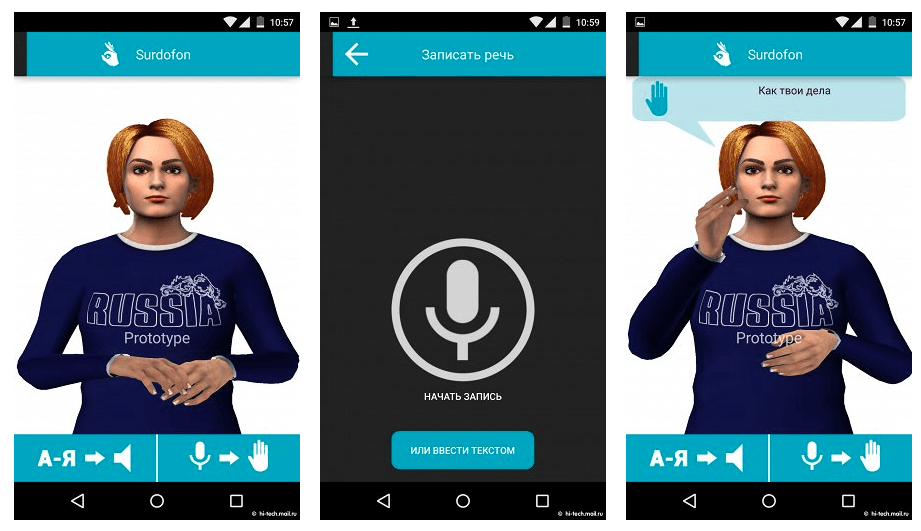Мобильное приложение Сурдофон позволяет распознать речь собеседника и перевести ее на русский жестовый язык. Со своей стороны, глухой собеседник набирает текст, который озвучивается компьютерным синтезатором речи.