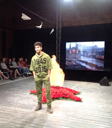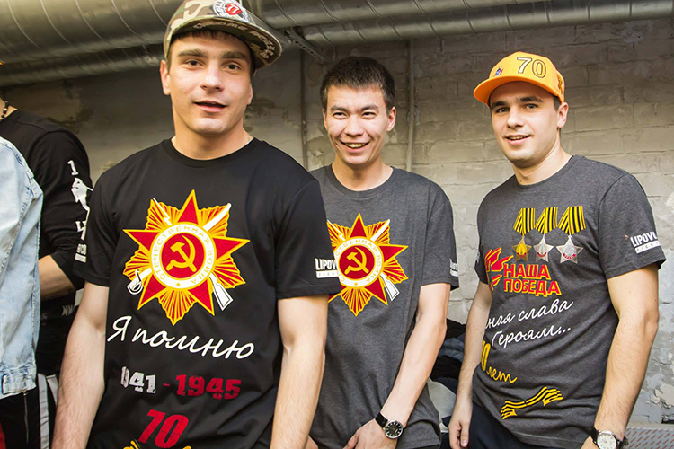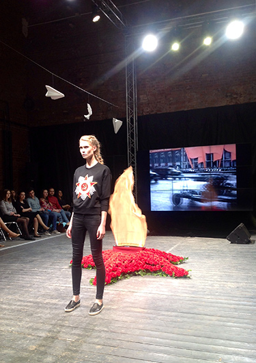 «Я вчера посмотрела “Сталинград” Бондарчука и теперь подсела на патриотическую тему!» — шепчет на ухо подруге посетительница показа мод и одновременно конкурса патриотических коллекций «Победа-70», организованного в конце апреля в московском ДК «Лофт» ко Дню Победы. На импровизированном подиуме вокруг как бы Вечного огня, сделанного из гвоздик и подсвеченной развевающейся ткани, идут модели. Кремлевская звезда из бисера на черной толстовке сменяется вышитым собором Василия Блаженного. Вот свитер со Спасской башней. Вот орден Отечественной войны, сделанный из стекляруса вручную. «Ну, футболки с Путиным уже приелись. А вот эти свитшоты с Кремлем ничего! Стритстайлеры будут луки выкладывать, за ними Москва подтянется», — сообщает в ответ подруге девушка с георгиевской лентой в косе.