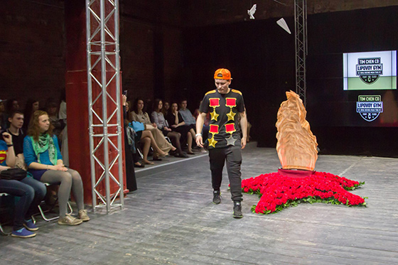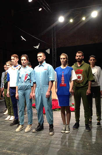 Вне конкурса — две коллекции. Среди них — один из крупнейших патриотических брендов на рынке «Сердца России», который продает футболки и чехлы для телефона с Владимиром Путиным на фоне военной техники. Второй внеконкурсный участник — коллекция Lipovoy Gym от трехкратного чемпиона мира по кикбоксингу Александра Липового. Под речитативы российской рэп-группы «Баста» появляются боксеры. Их глаза прикрывает бейсболка, на черных майках — принты военных наград и вышитые ордена «За отвагу» размером с тарелку. Штаны расшиты шевронами «Россия — Балтийский флот», «Россия — Тихоокеанский флот», «Россия — Внутренние войска».